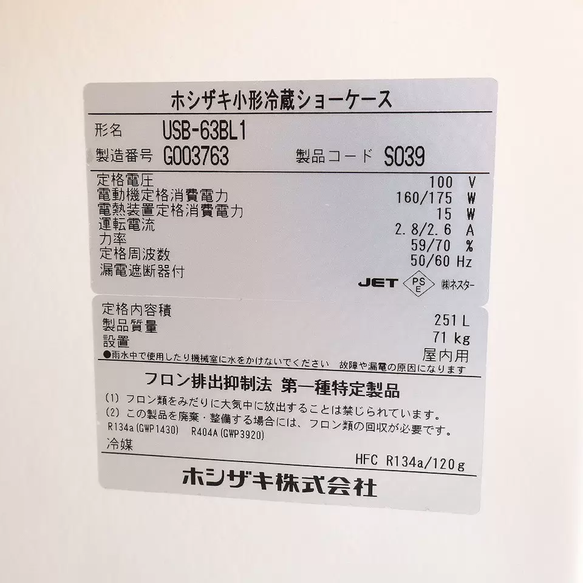 冷蔵ショーケースUSB-63BL1